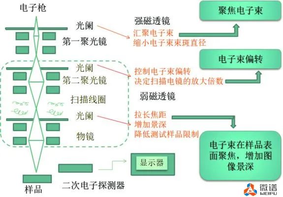 扫描电子显微镜从原理上讲就是利用聚焦得非常细的高能电子束在试样上扫描,激发出各种物理信息。通过对这些信息的接受、放大和显示成像,获得测试试样表面形貌的观察,即二次电子成像。