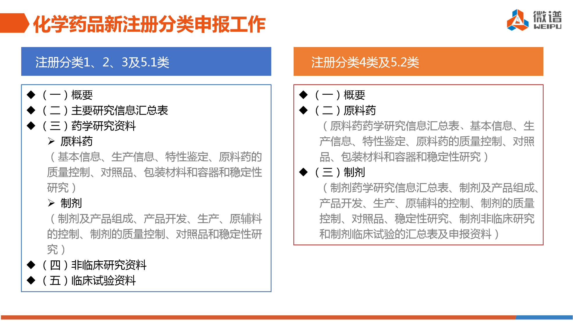 目前化学药品新注册分类分为5类,其中4类和5.2类相比较其他几类,在原料药上要求“原料药药学研究信息汇总表”,在制剂上要求“制剂药学研究信息汇总表”、“制剂非临床研究和制剂临床试验的汇总表及申报资料”。