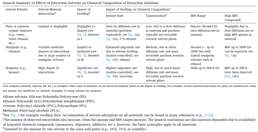 不同浸提溶剂下浸泡医疗器材料,会导致浸提释放物质无论个数还是种类,都可能有非常大的差异。根据相似相溶原理,⼀般情况下,我们会优先考虑浸提媒介的极性和器械材质的极性(如下文献所述)。