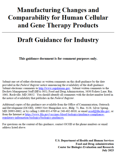 8. 2023. FDA. Draft Guidance for Industry: Manufacturing Changes and Comparability for Human Cellular and Gene Therapy Products.