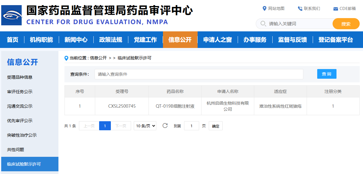 1.启函生物通用型双靶点CAR-T细胞产品QT-019B治疗难治性系统性红斑狼疮(rSLE)的新药临床试验申请获国家药监局默示许可