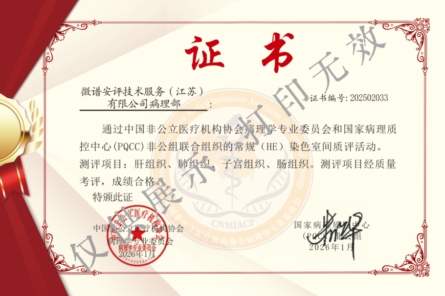 微谱医疗器械安评实验室顺利通过认证,标志着我们病理科的常规病理染色技术已达到国家级质控标准。本次项目合格,不仅验证了微谱医疗器械安评实验室在常规(HE)染色领域的质量控制能力,也体现了我们技术服务的规范化与稳定性。