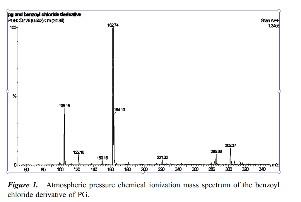 Gao S等多位专家[1]的研究表明,他们使用苯甲酰氯衍生化丙二醇,并且建立了定量分析大鼠血浆和肺中的丙二醇的分析方法,检测限分别为0.27 μg·mL-1和1.1 μg·g-1。分析认为,通过在结构中引入苯甲酰基,气态条件下丙二醇的碱性和质子转移能力都得到了明显提高。