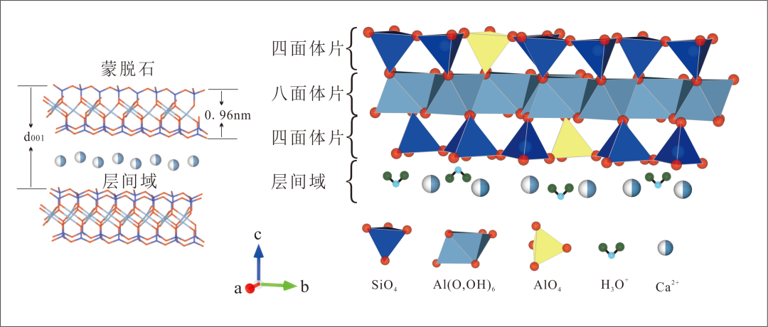蒙脱石属于蒙皂石族二八面体型蒙脱石亚族,单斜晶系,a0=5.17,b0=8.94,c0=15.2Å,β=90°±,Z=1,是典型的2:1型层状硅酸盐矿物,分子式(Na,Ca)0.33(Al,Mg)2[Si4O10](OH)2·nH2O,中间为铝氧八面体,上下为硅氧四面体所组成的三层片状结构粘土矿物。